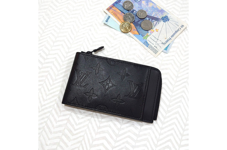 上質のカーフレザーに型押しされたモノグラムシャドウがオシャレです。 札入れはありませんが、紙幣は折りたたんで収納可能。