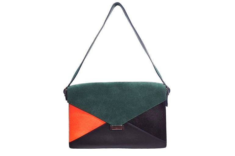 グリーンのスエード、オレンジとブラックのハラコ、ブラックレザーの組み合わせがカラフルな2WAYバッグです。
